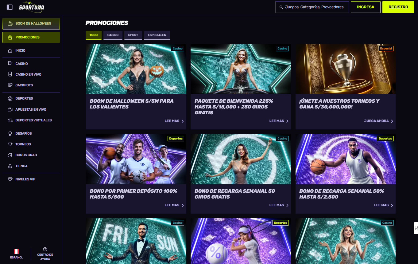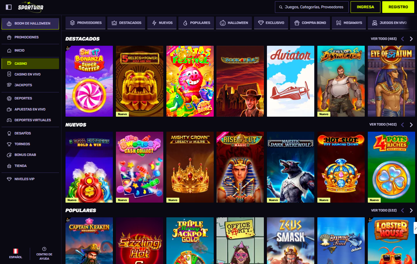 Además de las apuestas deportivas, Sportuna ofrece un casino online completo con entretenimiento diversificado. La sección de tragamonedas incluye cientos de slots de proveedores premium como Pragmatic Play, Evolution, Play’n GO y muchos más, con títulos populares y lanzamientos recientes.